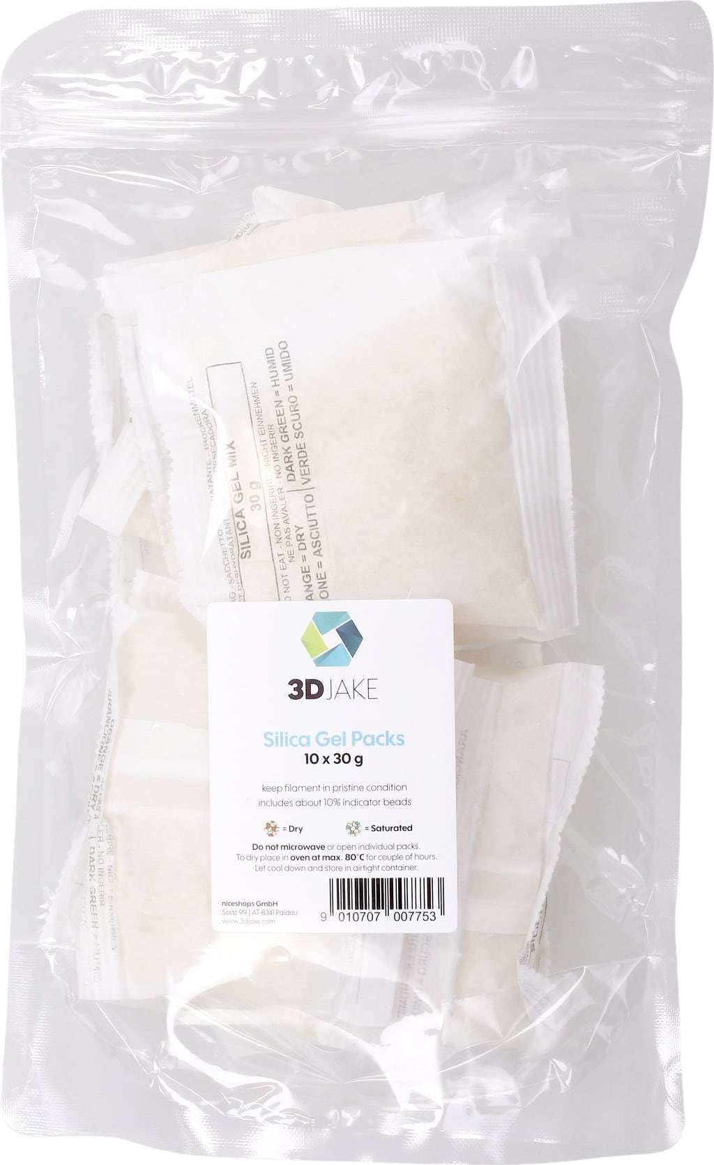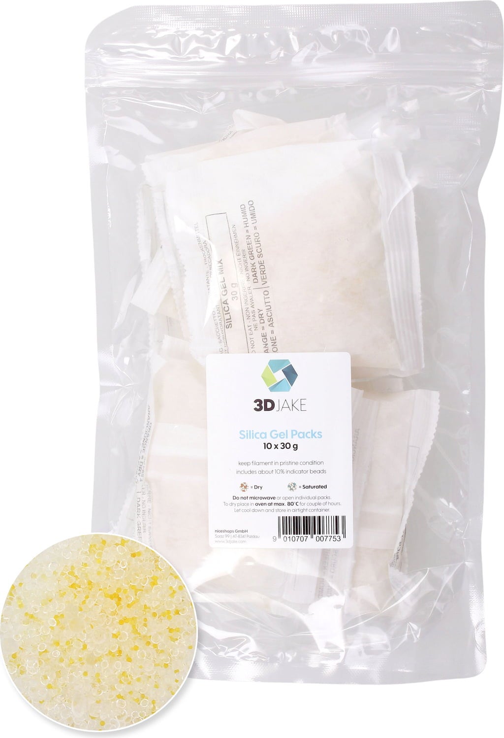 3DJAKE Silica Gel гарантира, че влагата не може да навреди на нишките ви! Умните оранжеви топчета в чантата служат като индикатор за влага: щом се наситят с влага, те се променят от оранжево в синьо-зелено. По този начин знаете точно кога е време да изсушите нишката и да освежите гела.