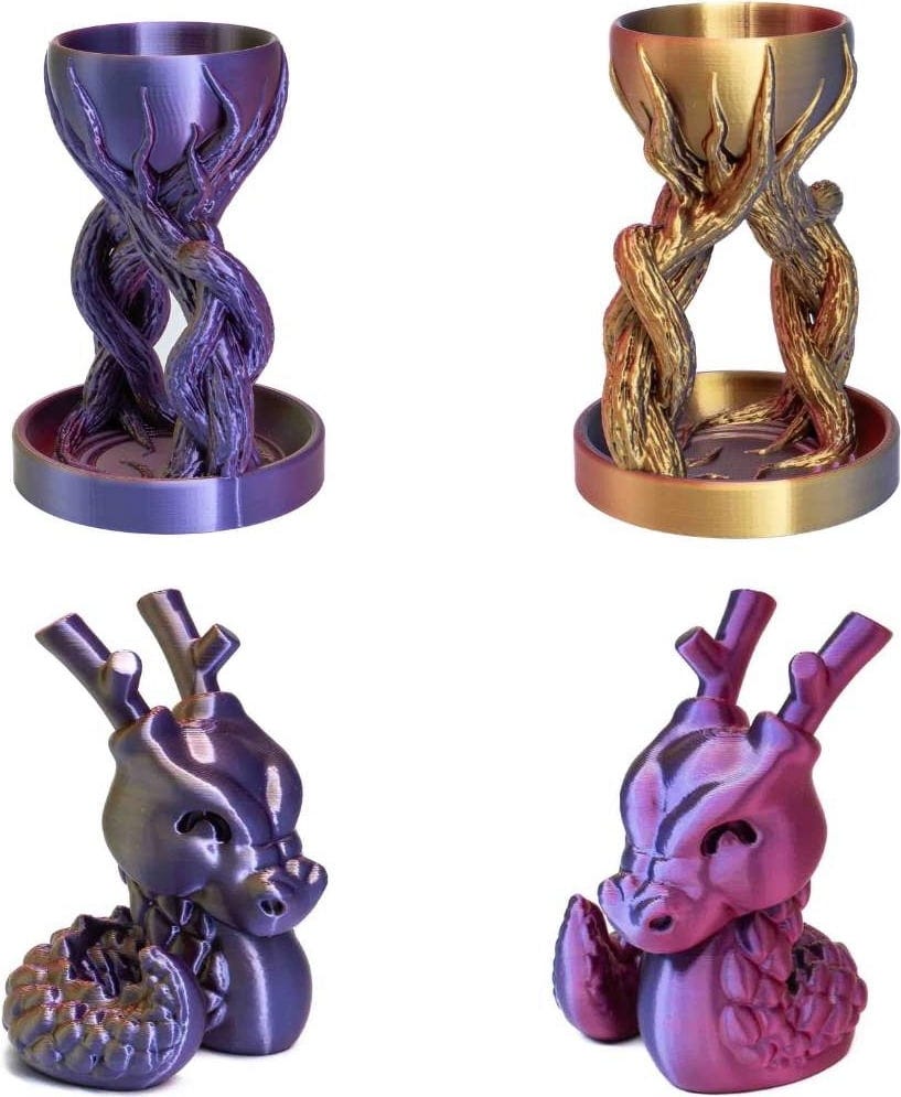 Чрез модерна ко-екструзионна технология PLA Silk Multicolor обединява два или дори три нюанса само в една нишка. Това създава плавни цветови преливания и уникални отблясъци, които се променят според ъгъла на гледане. Всеки принт се превръща в уникат – независимо дали става дума за вази, фигури, бижута или декоративни аксесоари за дома.
