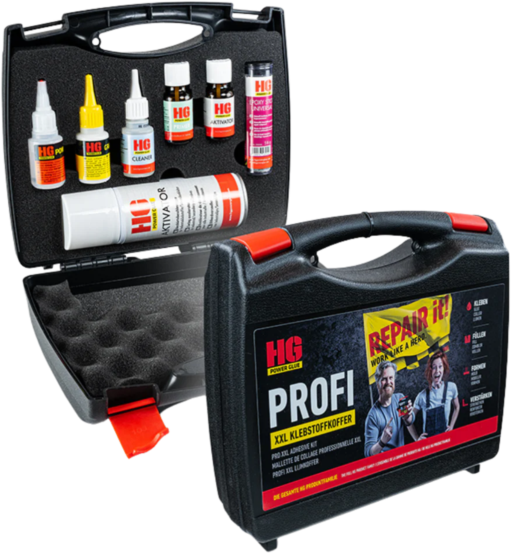 С XXL куфара с лепила HG Power Glue имате под ръка подходящото решение за почти всеки ремонт! Независимо дали става дума за счупена керамика, повредени пластмасови части, изкъртени участъци или взискателни ремонти в домакинството, моделизма или автомобилната сфера, лепилата в XXL куфара покриват повечето приложения!