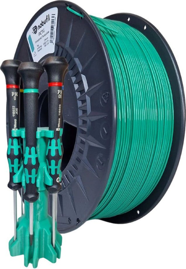 PCTG на Nobufil е филамент, изработен от рециклирани пластмаси, които се получават като производствен отпадък при индустриална обработка. В сравнение с нишките от PETG този полимер се характеризира с по-висока устойчивост на удар, което го прави подходящ за производство на механично натоварени компоненти.