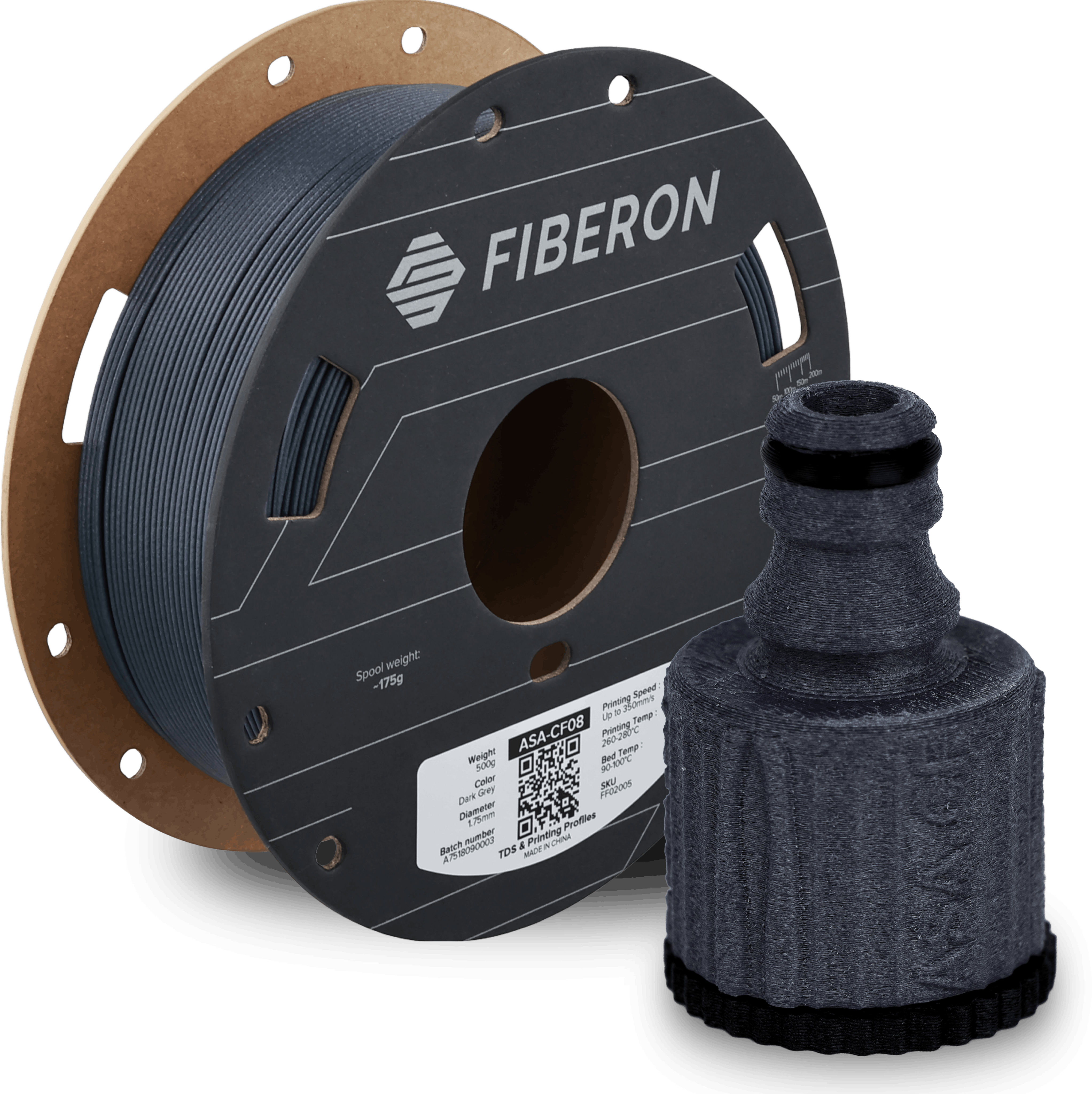 Fiberon™ ASA-CF08 е високопроизводителен филамент на основата на акрилонитрил-стирол-акрилат (ASA), подсилен с 8% въглеродни влакна. Резултатът е материал с изключителна твърдост, висока размерна стабилност и матова, лека повърхност, която се отличава както с механичните си свойства, така и с естетическо качество.