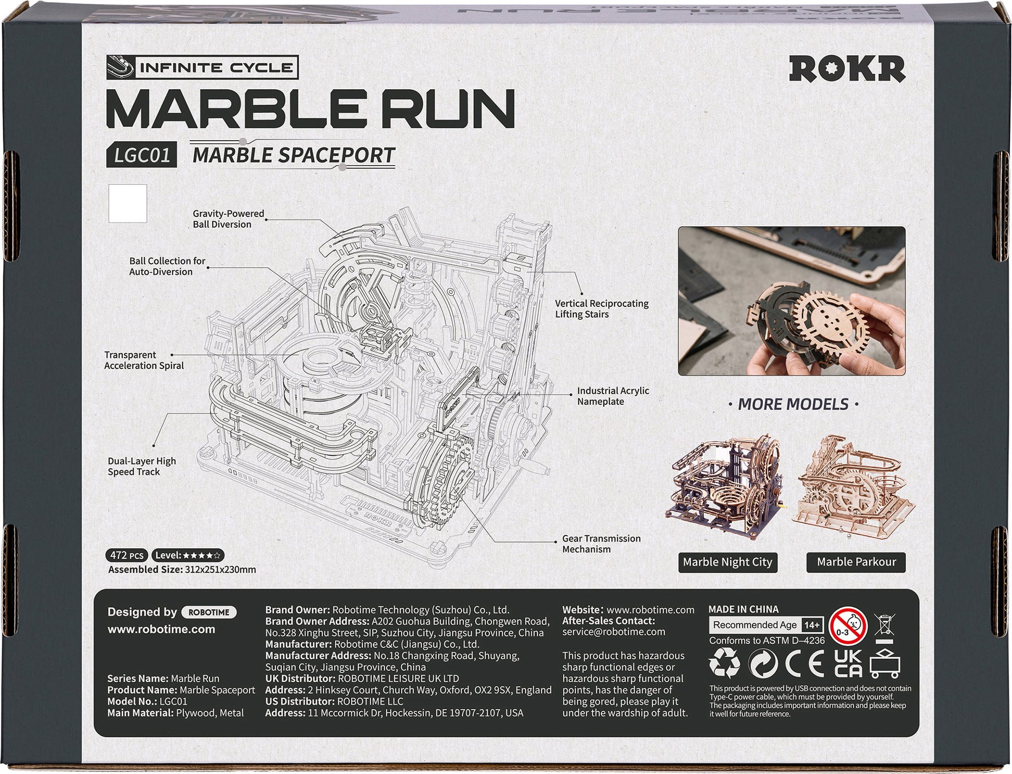 Съвет: Marble Spaceport е готов за разширяване. Със специален свързващ пакет може да се комбинира с Marble Night City. Заедно се получава още по-голяма, по-сложна система и свързана механична вселена, задвижвана от един единствен мотор.