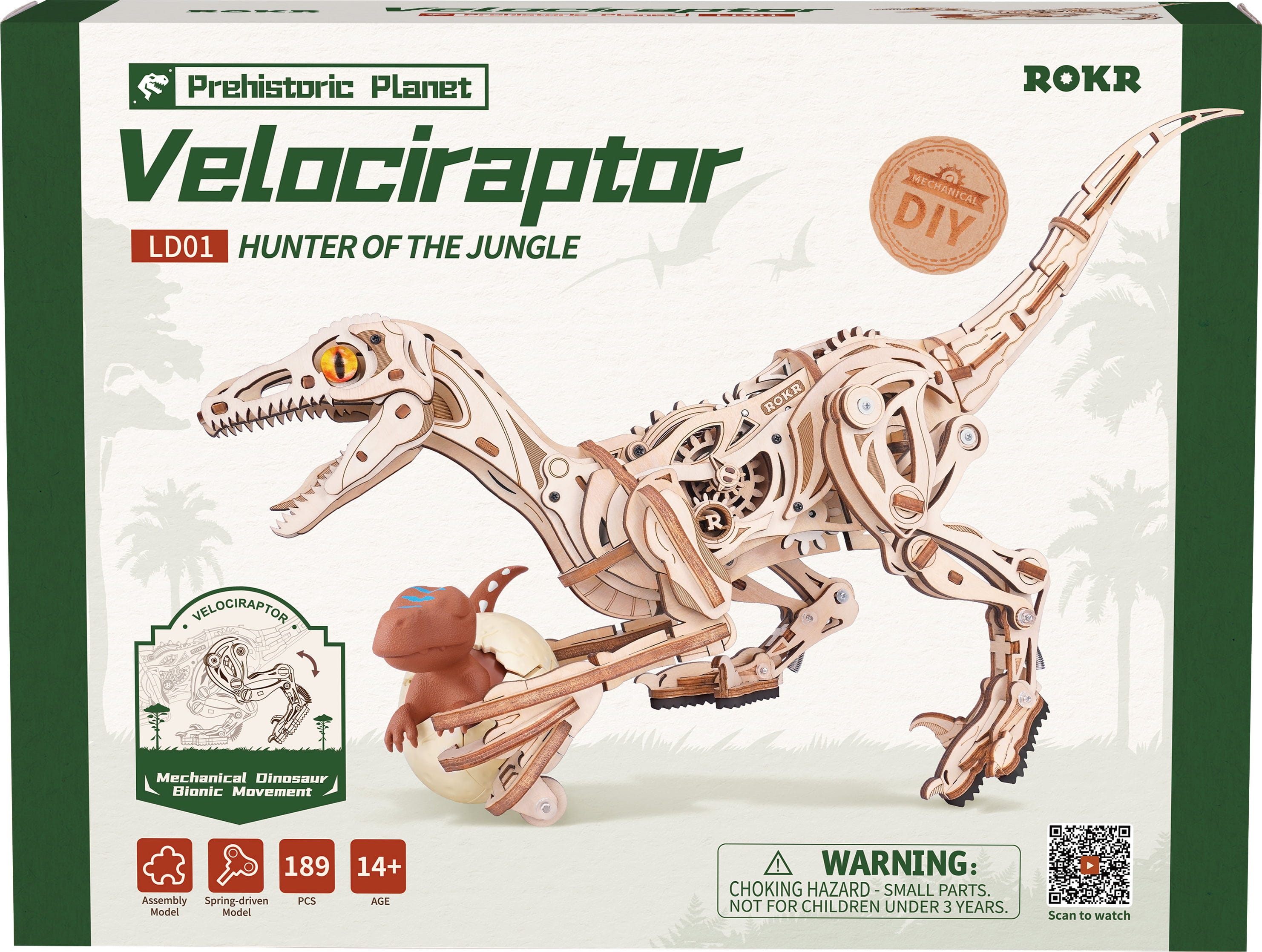 ROKR Velociraptor е механичен 3D дървен пъзел, който съчетава движение, напрежение и праисторическа сила. Със стройната си, „скелетна“ форма, остри нокти, назъбени зъби и светещи кехлибарени очи, той изглежда сякаш току-що е избягал от кредата – готов за следващия спринт.