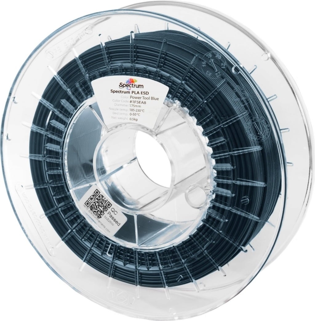Spectrum PLA ESD е специализирано, антистатично PLA филаментно решение, разработено за приложения, при които електростатичната безопасност, прецизността на печат и удобството при работа са от най-голямо значение. Като модифициран PLA биополимер, материалът комбинира лесната обработваемост на класическите PLA филаменти с постоянна ESD-защита, което го прави идеален за употреба в чувствителни електронни среди, както и в EX-/ATEX-зони, където предотвратяването на искрообразуване е задължително.