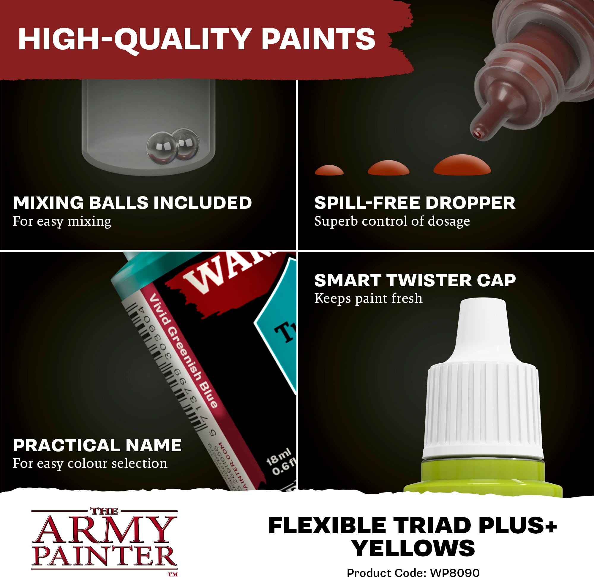 Със системата Flexible Colour Triad от The Army Painter е разработена интелигентна концепция, която улеснява смесването на цветовете и избора на нюанси при боядисване на миниатюри. Всяка триада се състои от шест цвята, изградени върху една обща базова боя. Тези цветове варират от много тъмен до много светъл нюанс и образуват хармонична цветова палитра.
