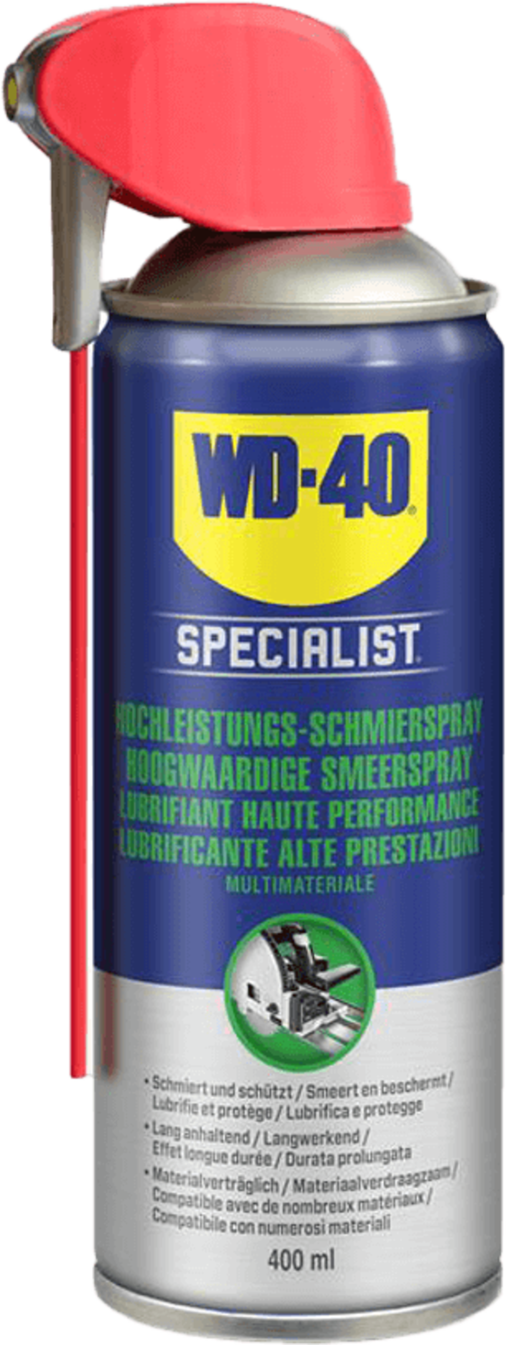 WD-40 Specialist високоефективен смазочен спрей е мощен смазочен продукт за оптимизиране на плъзгащите и разделителните свойства на механични компоненти. Той образува устойчив, маслен смазочен филм, който ефективно намалява триенето и износването и по този начин може да удължи експлоатационния живот на инструменти, машини и оборудване.